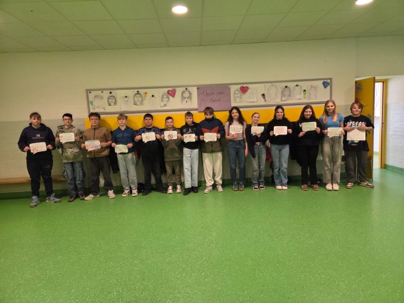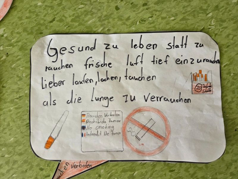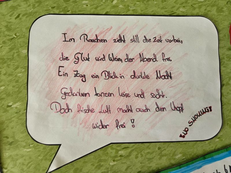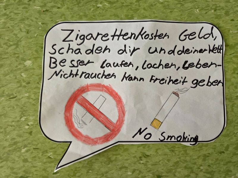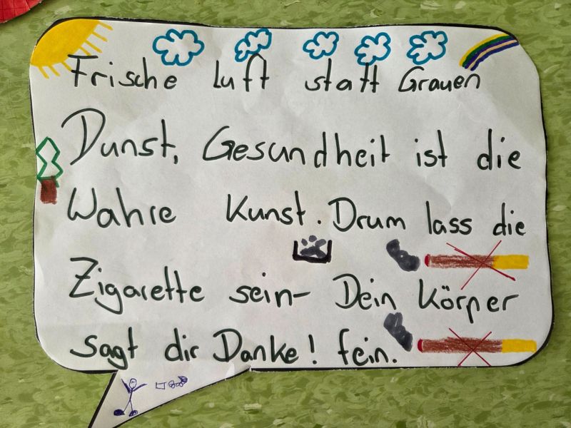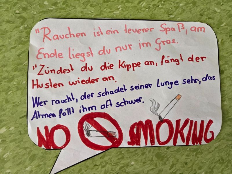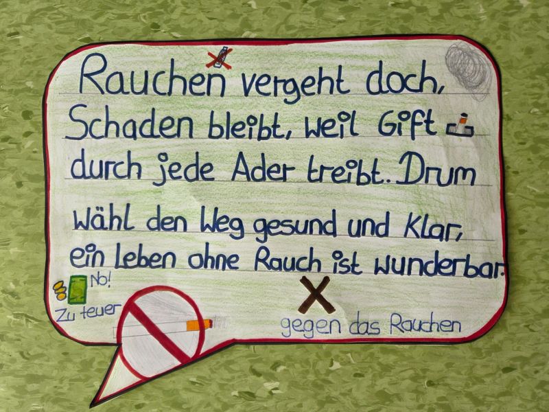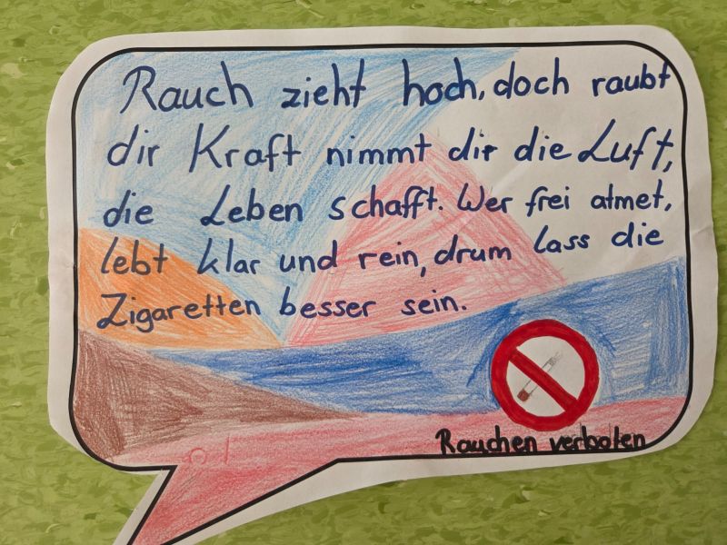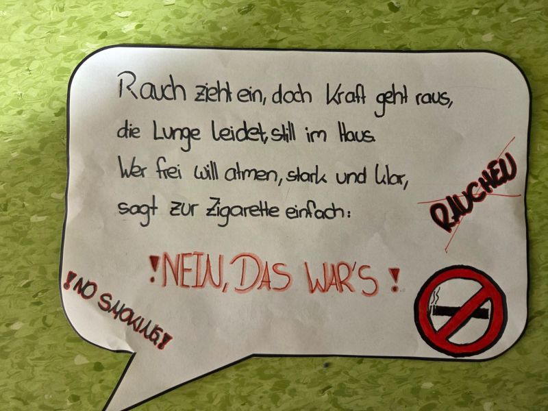 Zusätzlich beteiligte sich die Klasse auch am Kreativwettbewerb. Mit viel Engagement und Kreativität gestalteten die Mädchen und Jungen im Deutschunterricht eigene Anti-Rauch-Reime. Dabei durften sie sich auch von künstlicher Intelligenz inspirieren lassen. Die entstandenen Reime wurden anschließend vertont. So entstanden originelle Beiträge, die zeigen, wie wichtig den Schülerinnen und Schülern das Thema Gesundheit ist.