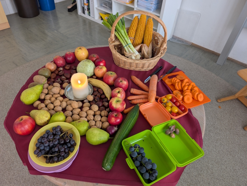 Im Religionsunterricht der Klasse 2b nahmen die Kinder viel verschiedenes Obst und Gemüse aus ihrem Garten mit.