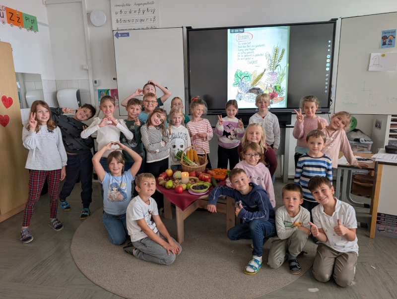 Gemeinsam dankten sie Gott unter anderem für die reichliche Ernte. Bei einer Meditation lernten die Kinder die einzelnen Lebensmittel noch intensiver und anders kennen, als zuvor.
