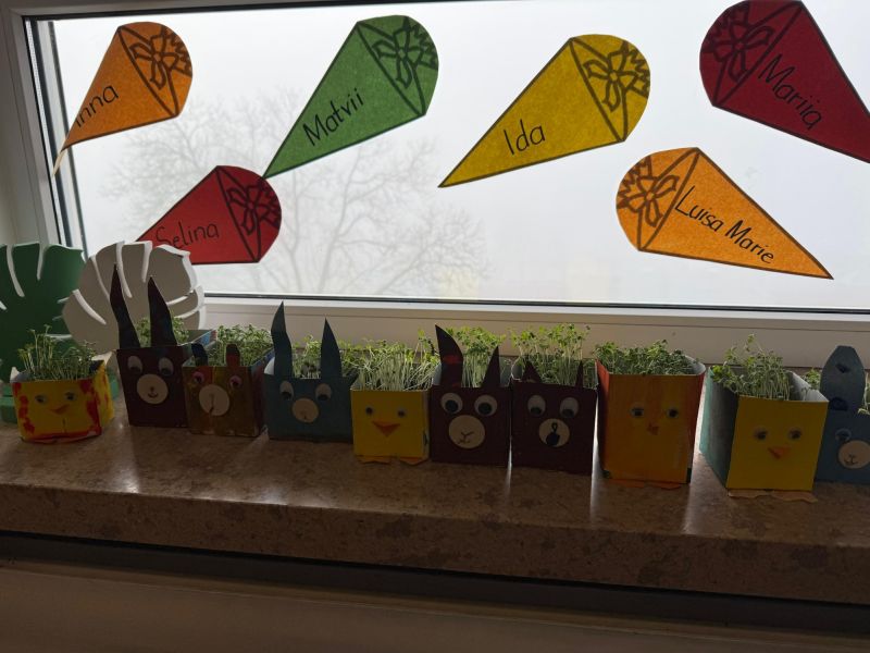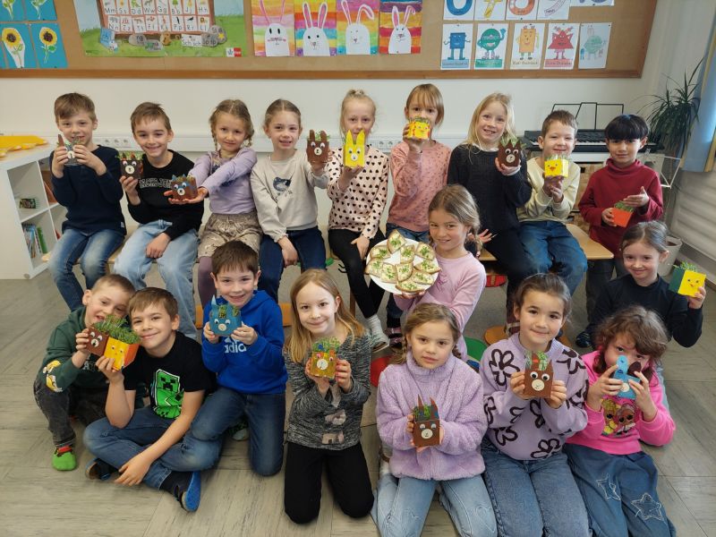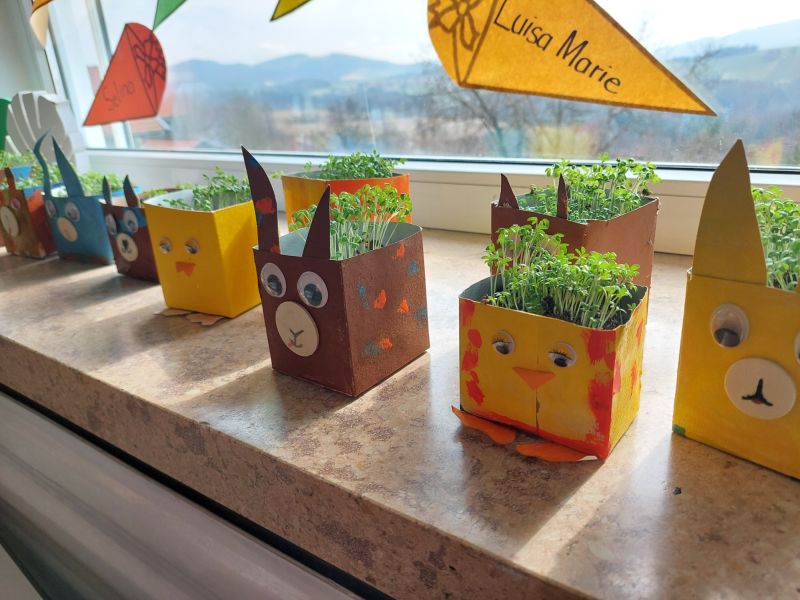 Aus leeren Milchkartons gestalteten die Kinder mit viel Fantasie kleine Pflanzbehälter zum Thema Ostern. Dabei entstanden mit Hilfe von Frau Wagenpfeil und Frau Wiltschko fröhliche Hasen und niedliche Küken – ein tolles Beispiel dafür, wie aus vermeintlichem Abfall etwas Neues entstehen kann.