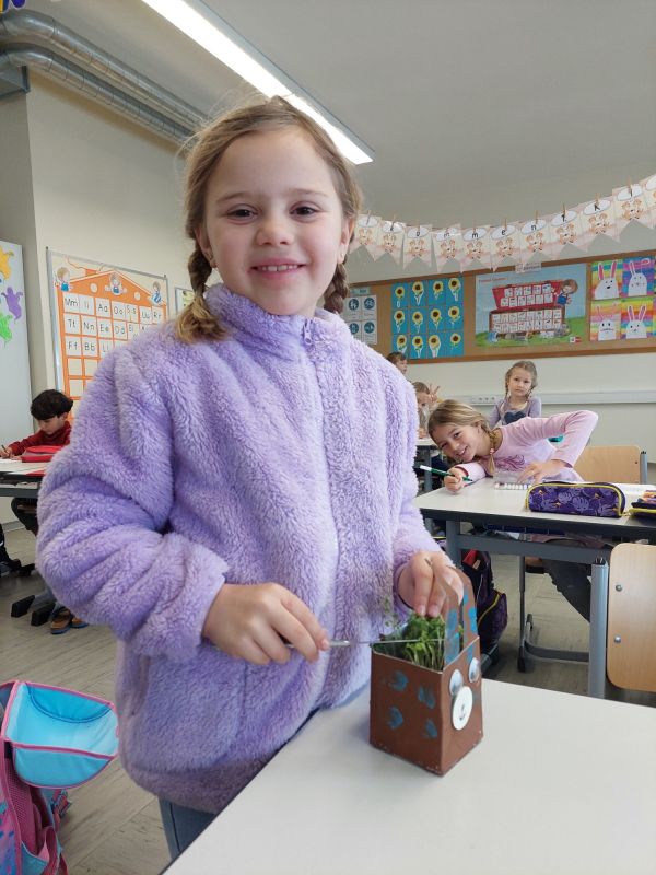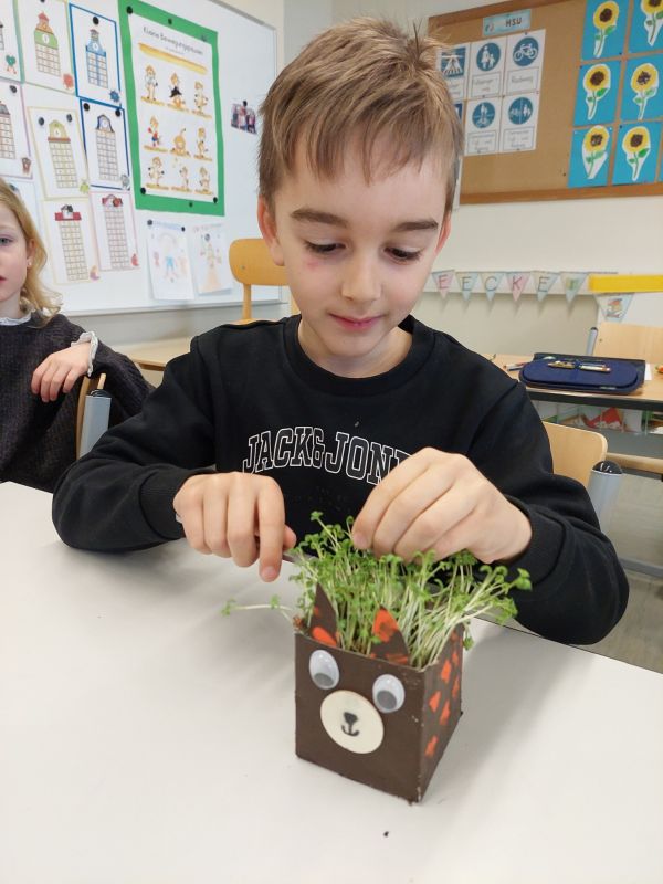 Anschließend wurden die selbst gestalteten Gefäße mit Erde gefüllt und mit Kressesamen bepflanzt. Schon nach wenigen Tagen konnten die Kinder beobachten, wie die ersten grünen Spitzen wuchsen.